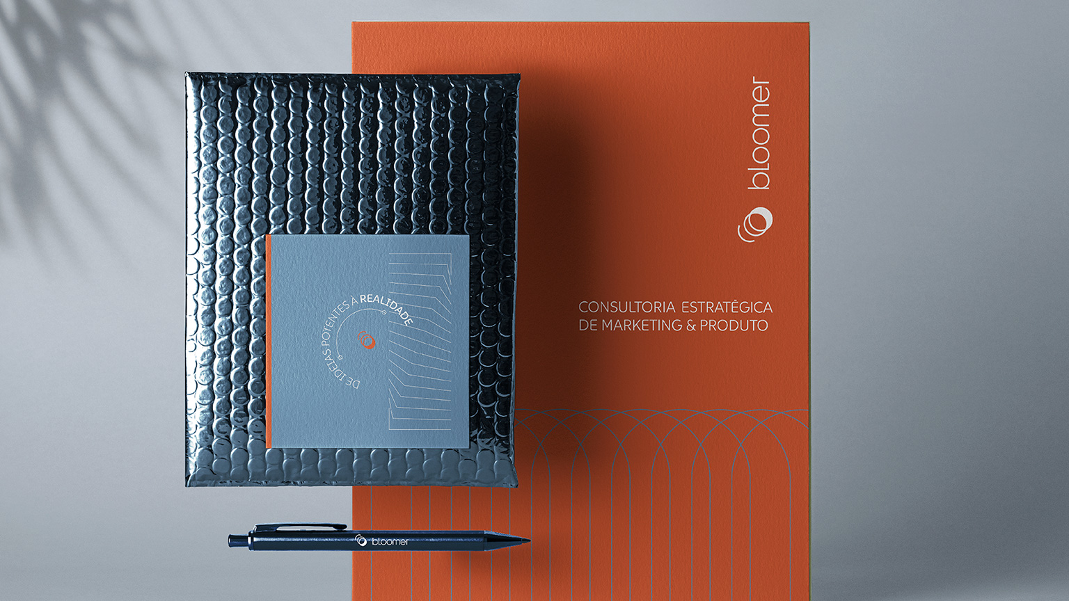 Materiais institucionais e extensões da marca: Impressos, sacolas, brindes e objetos de relacionamento.